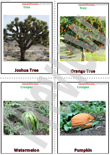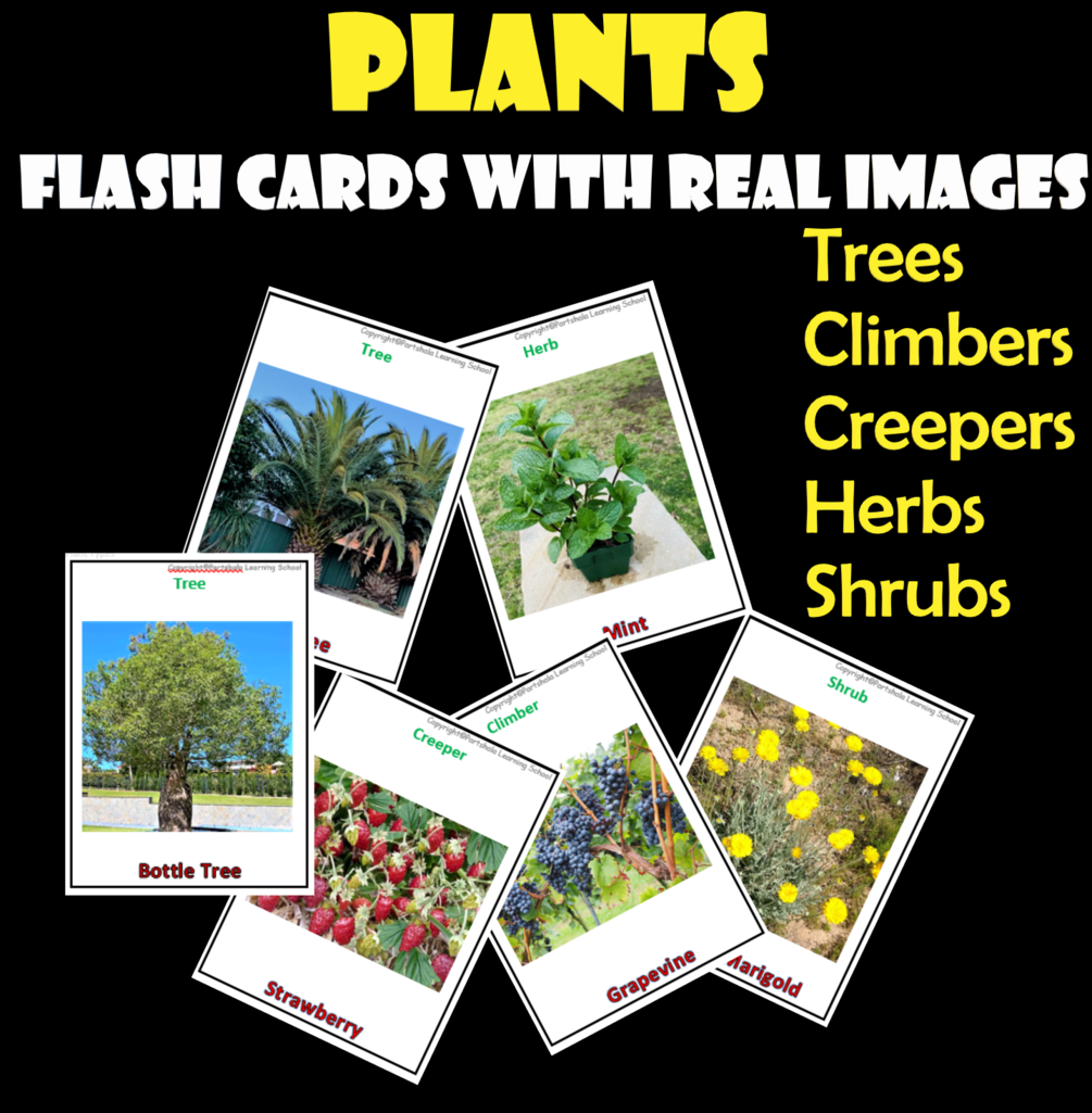 Set of flash cards (30 in total) with real images for 5 Types of Plants i.e. 6 flash cards for each plant type. Printable as 2 cards per page. · Same flash card printable as 4 per page.